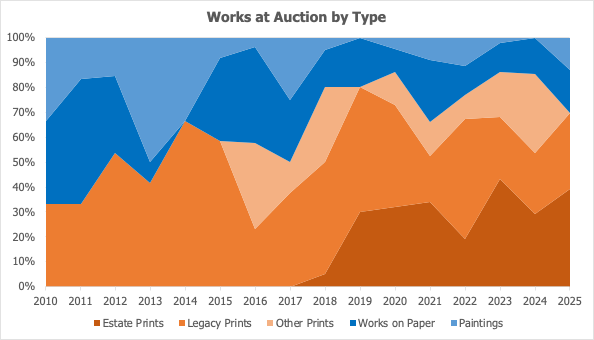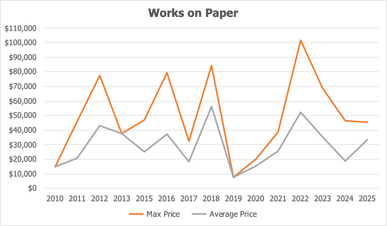 On average, 3 - 5 works on paper sell at auction each year, occasionally hitting double digits in 2018 and 2021. However, prices have remained remarkably flat since 2010. Unlike the Legacy Prints, which show steady long-term growth, these works show little price appreciation.