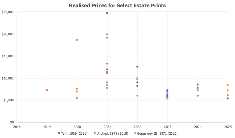 Similar to the Legacy Prints, the highest price achieved was often double the lowest in the peak year of 2021. For example, Tahi, 1969 (2021) sold for both $24,625 and $11,950, remarkable for a print released only months earlier.