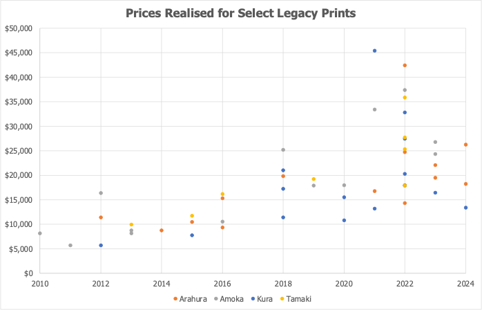 Mixed: Tawa - Barry Lett print, higher than pre-2020 prices; Then - achieved high prices in 2018, has continued downwards throughout 2023 - 2025; Kura - prices in 2023 and 2024 have been similar to 2018 - 2021 prices (with an exception of an outlier in 2021), but has had a low sell through rate in 2023 and 2024); Tamaki - no sales since 2022.