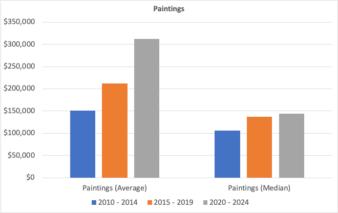 Paintings: Between 2020 – 2024, six works sold for over $500k, including one that fetched more than $2 million. In the previous five years, only two works cleared $500k. This top-heavy activity pushed the average price up 47%, but the median rose just 5%, not even keeping pace with inflation.