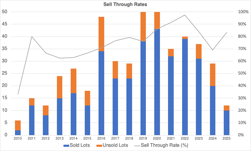 Sell-through rates show if works are being successfully sold at auction. It’s an indicator of the success of the auction, as well as bidder interest and effective estimate pricing. McCahon’s works generally achieve good sell-through rates and we can see they have mostly been above 70%, reaching a peak during the COVID years of 2020 - 2022. It’s incredible to see that of the 40 McCahon works that came to auction in 2022, only one didn’t sell, resulting in a 98% sell through rate that year. It’s now dropped back down to pre-COVID levels, and though 2024 was weak, 2025 is tracking better.