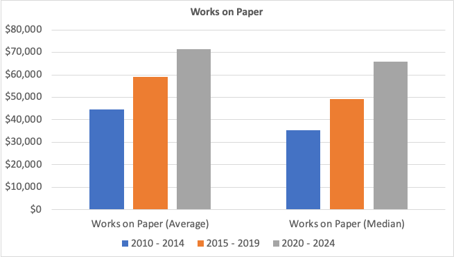 Works on Paper: The steadiest category, with smaller gaps between average and median, suggesting a healthier middle market without wild outliers.
