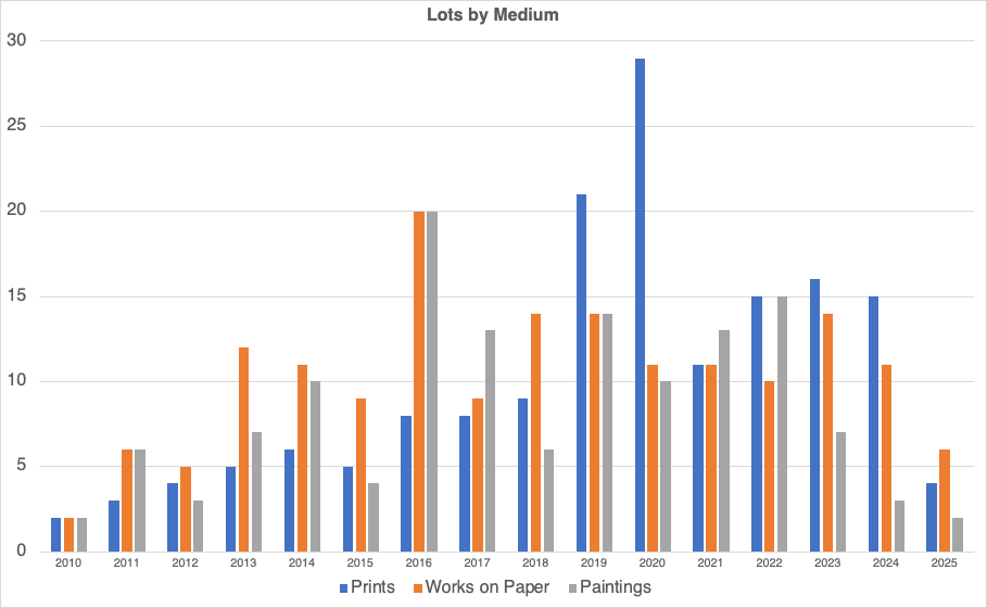 I’ve grouped sales into five-year blocks to smooth out the noise and see the longer-term trends. On the surface, all three mediums (prints, works on paper, and paintings) have risen since 2010. But a closer look reveals a widening gap between average and median prices, especially for prints and paintings.