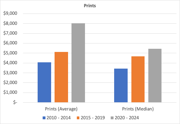 Prints: Between 2015-2019 and 2020-2024, average print prices climbed 57%, while median prices rose 16%. Much of this growth is tied to the 2019 release of Tomorrow will be the same but not as this is, which now accounts for half of the top 20 print sales.