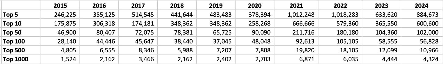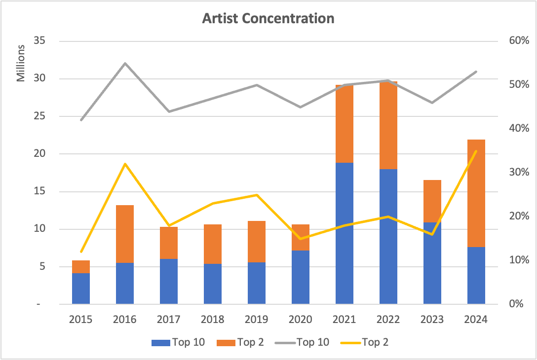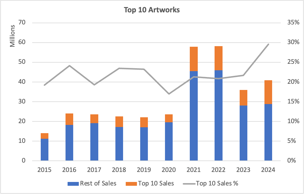 That’s true whether you look at artists or individual works. We see a similar trend across the top 10 artworks each year. They have consistently contributed between 20 - 25% of total sales over the last decade. Again, those 8 Goldies in the top 10 sold in 2024 cause the spike in contribution to 30%.