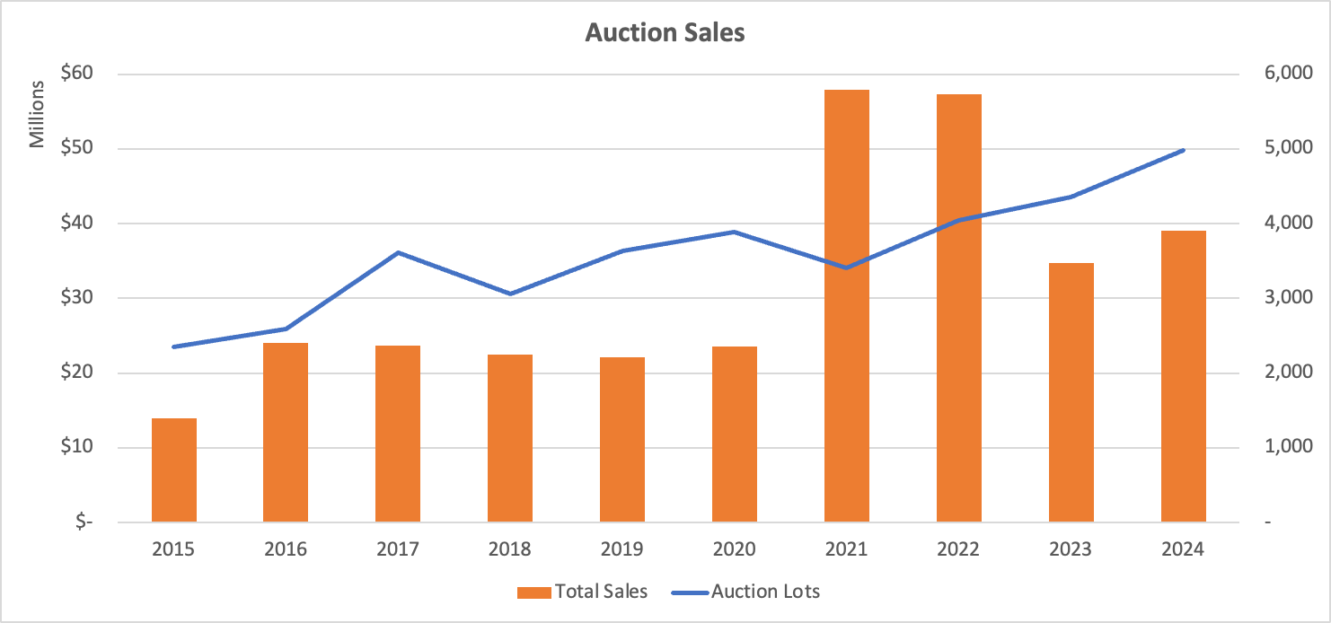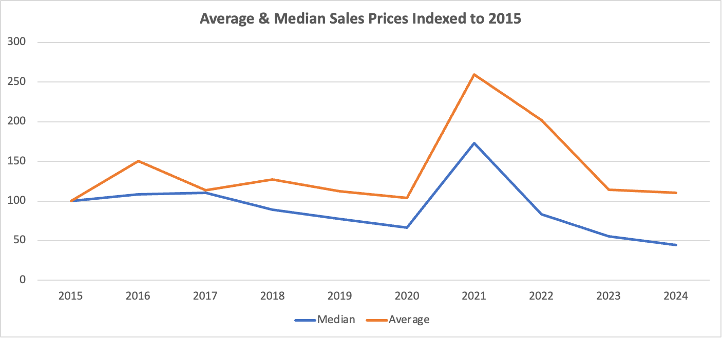 In 2015, the average price was $8288 and the median was $2162. By 2024, the average price has increased by only 10% while the median price is down by over half to only $956. Again, we see a significant spike in prices in 2021 and 2022.