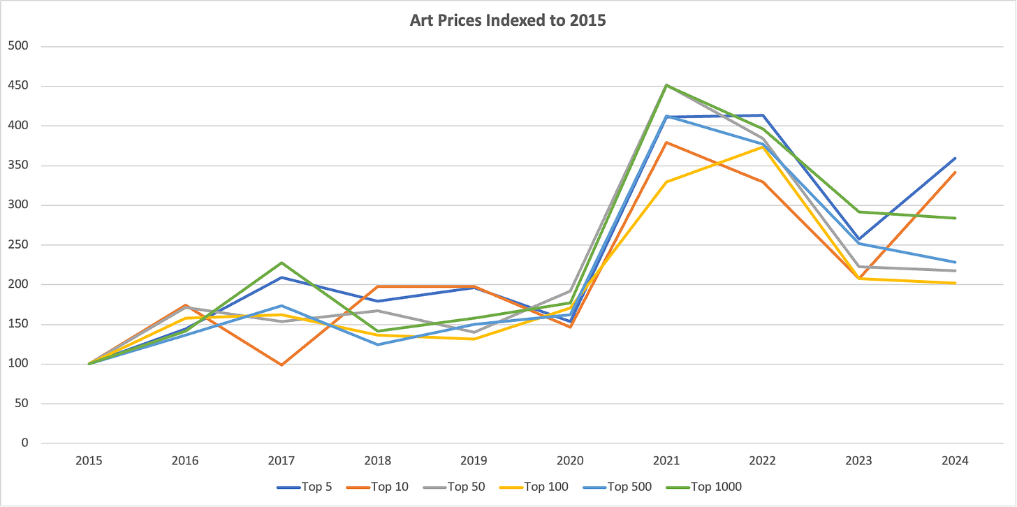 To illustrate this, an artwork ranked 500th cost ~$4,800 in 2015. By 2022, that same slot sold for ~$18,100 (nearly 4x higher). In 2024, it was ~$11,000 — still more than double 2015, but down from the COVID frenzy. And here’s what you would have bought: