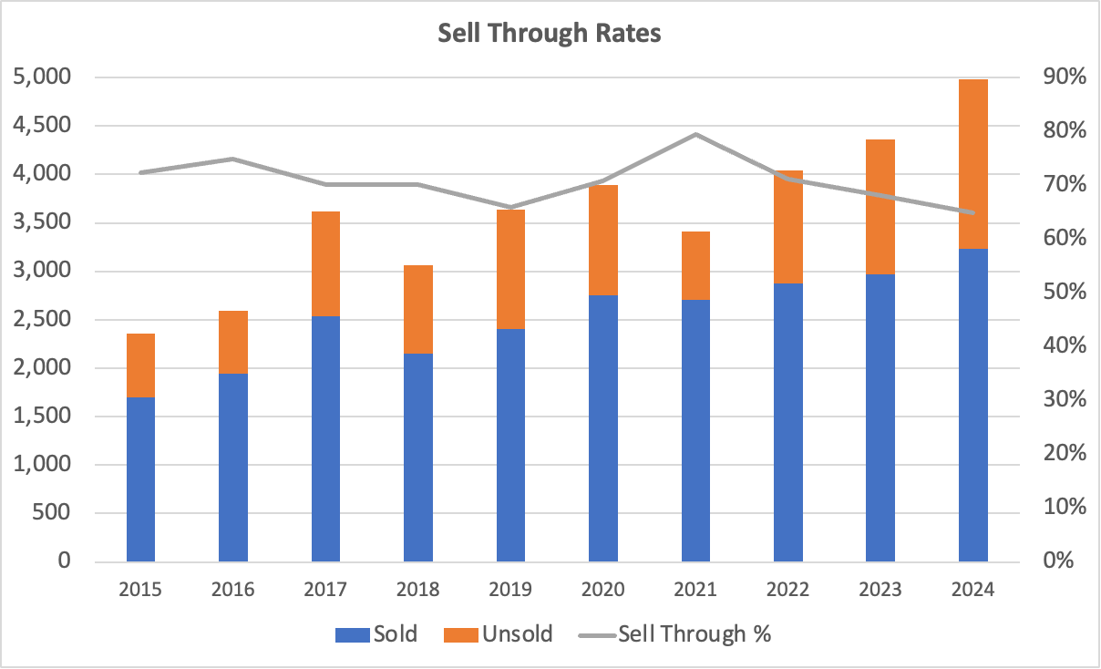 The next chart looks at how many lots actually sold. Sell-through is a proxy for auction house success, buyer demand, and pricing accuracy.
