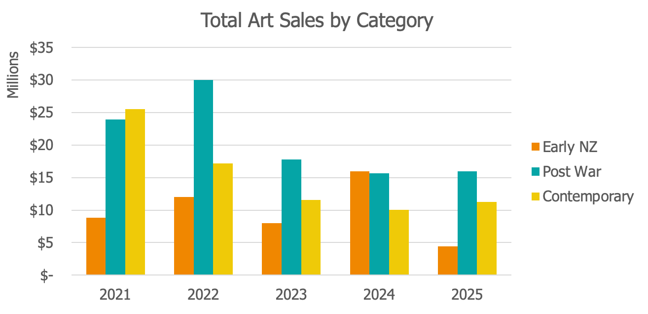 The category’s challenge is concentration. A small number of artists drive the majority of value, with Goldie dominant alongside Gottfried Lindauer and Frances Hodgkins. Without results from these three artists, overall results are materially affected.