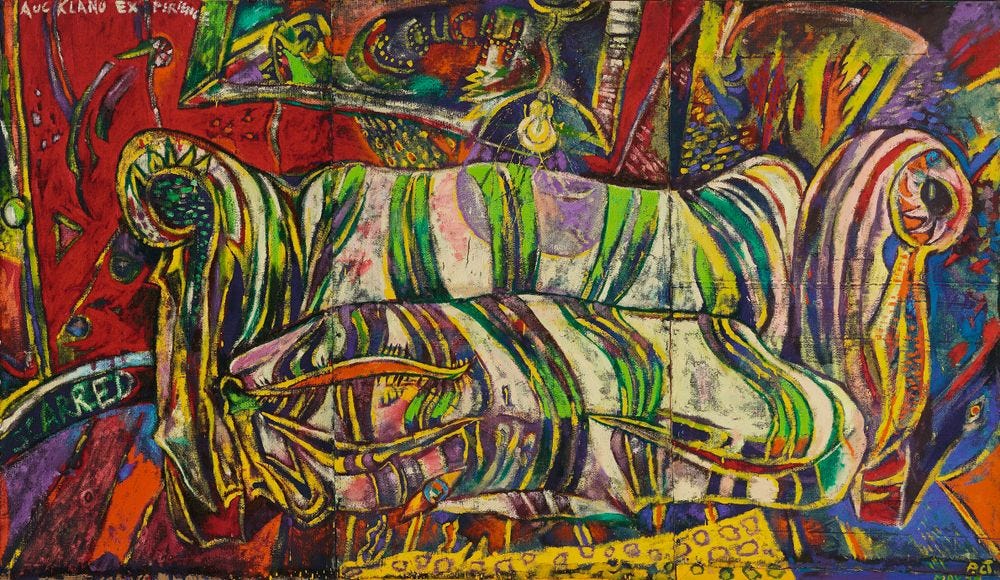 Philip Clairmont painted ordinary interiors in a raw, confrontational way, using intense colour and distortion. In The Scarred Couch, a damaged sofa fills the canvas, acting as a blunt stand-in for the artist’s frustration and mental state in 1970s Auckland.