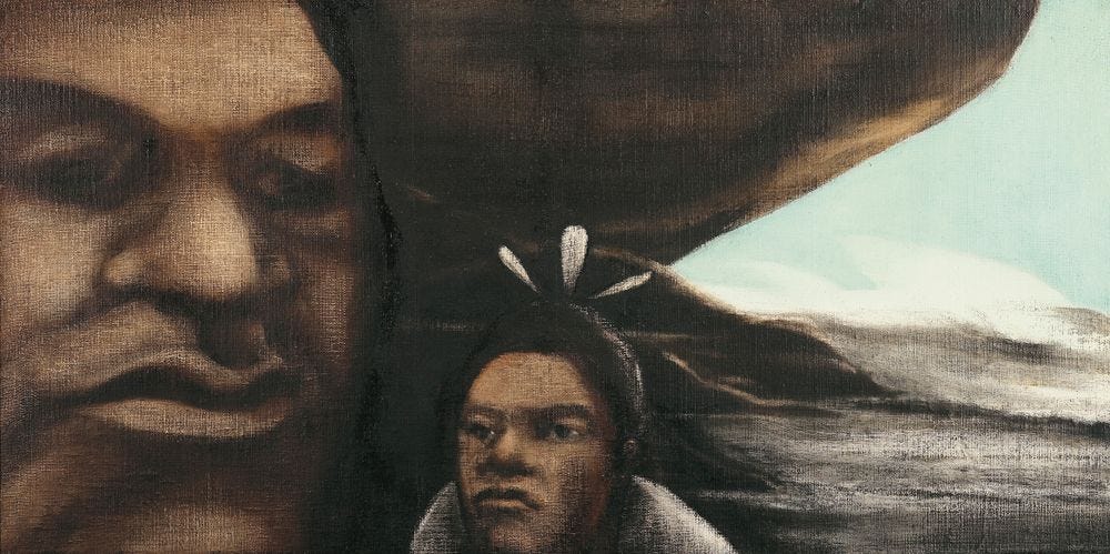 In Te Puhi o te Tai Haruru, Tony Fomison imagines the Taranaki coast as a place watched over by ancestors. The landscape becomes a reminder that memory, knowledge, and responsibility are passed down through generations.