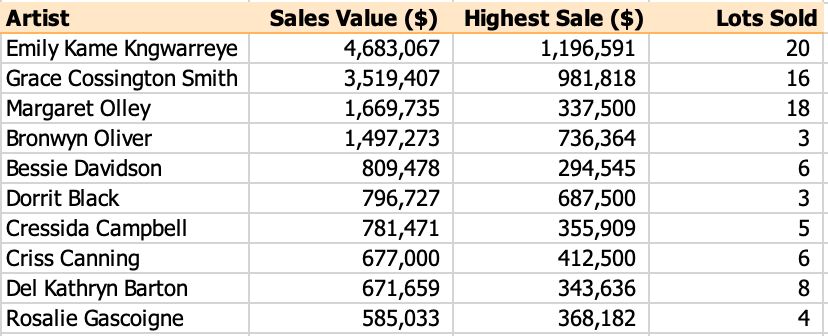 Across the most bankable female artists, several auction records were set. Emily Kame Kngwarreye, Grace Cossington Smith, Margaret Olley, Dorrit Black and Criss Canning each achieved new record prices.