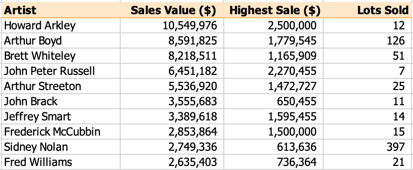 Arthur Boyd’s result showed both depth and breadth. A collection of prints from Tony and Indra Deigan, who had collaborated with Boyd to produce them, added volume to the market, but it was the major works that drove his ranking. Bride in the Hibiscus Bush sold for $1.78 million at Smith & Singer, the second-highest price achieved for a Boyd work, while a further 20 works sold for more than $100,000. Boyd’s market has also shown consistent growth over the past six years, indicating continued interest from collectors.