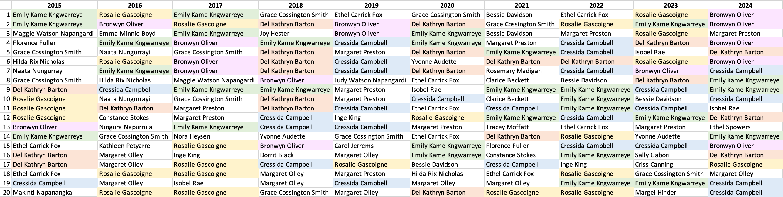 Core Five: Emily Kame Kngwarreye (29); Cressida Campbell (26); Rosalie Gascoigne (23); Del Kathryn Barton (22); and Bronwyn Oliver (15)