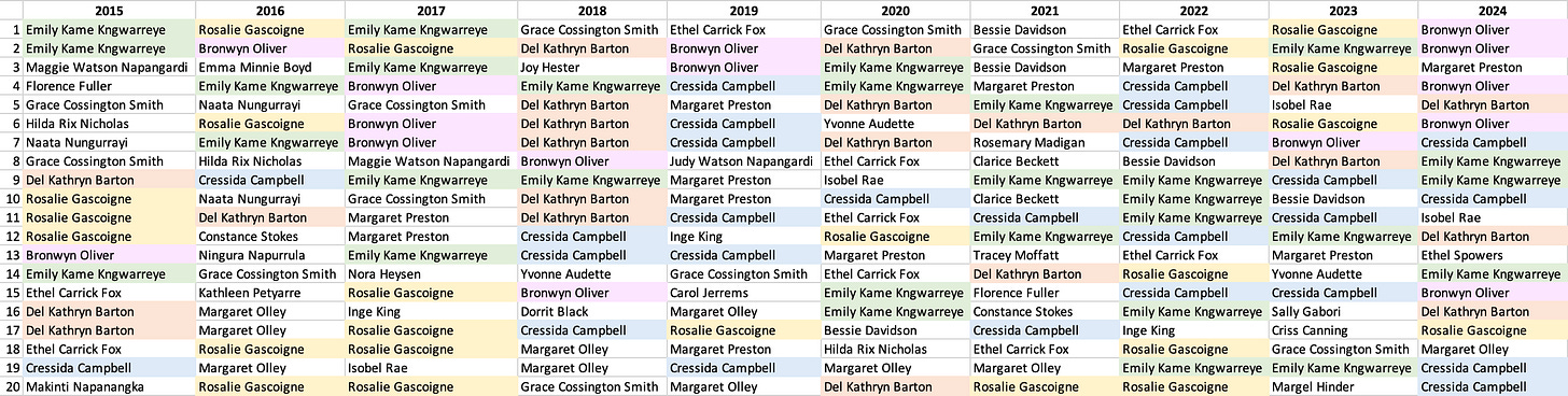Naata Nungurrayi and Maggie Watson Napangardi are two other artists worth knowing, each had 2 works in the top 200, but that was near the start of the 10 years analysed, while the volume of works coming to auction is limited and their sales sit below $1m.