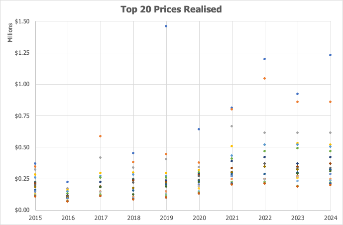 The price floor has risen meaningfully. Works ranked 15–20 now achieve prices that would have sat mid-table earlier in the decade.