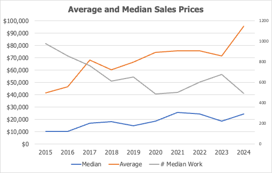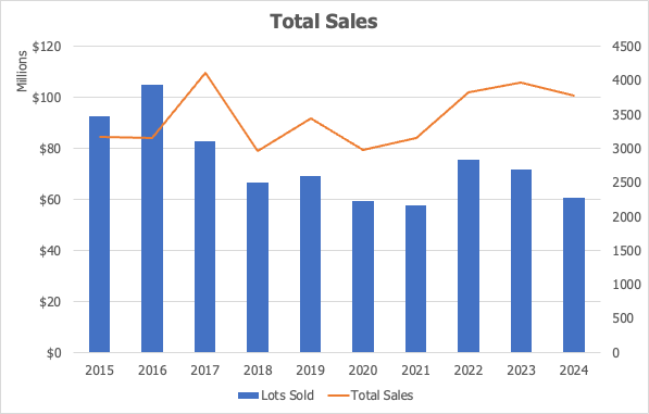 The market then rebounded in 2022 – 2023, with sales once again topping $100m, matching pre-pandemic highs (despite fewer lots being sold). And although 2024 saw a pull back from 2022 and 2023, sales still remains above the long term average.