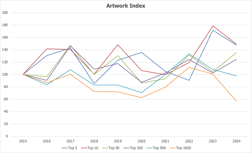 More revealing is the price index for the 5th, 10th, 50th, 500th, and 1000th most expensive work each year. This gives a far more nuanced view of which parts of the market have actually grown and which have not.