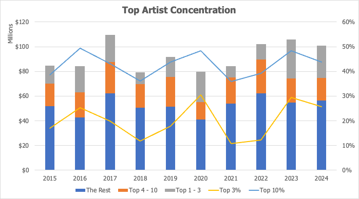 And the top 10 artworks have contribute an average 18% of the total sales each year over the last decade. Though in 2023 and 2024 this increased above 20%, again, reinforcing the view that the top end had found confidence coming out of the pandemic. Interestingly, this concentration amongst the top 10 artworks is higher in New Zealand, despite the much lower prices achieved. This is a reflection of the much smaller art market in New Zealand.