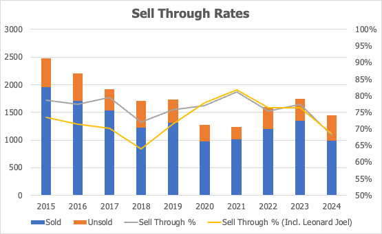 The concern is 2024 (and 2025, though not depicted above), where rates have slipped below 70%, despite fewer works coming to market. Not every auction house is affected equally, but the aggregate trend is unmistakeable.