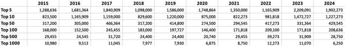 Top 50 / Top 100: ~2% annual growth. A bumpier path, dipping in 2020, peaking in 2022, easing in 2023, and rising again in 2024.