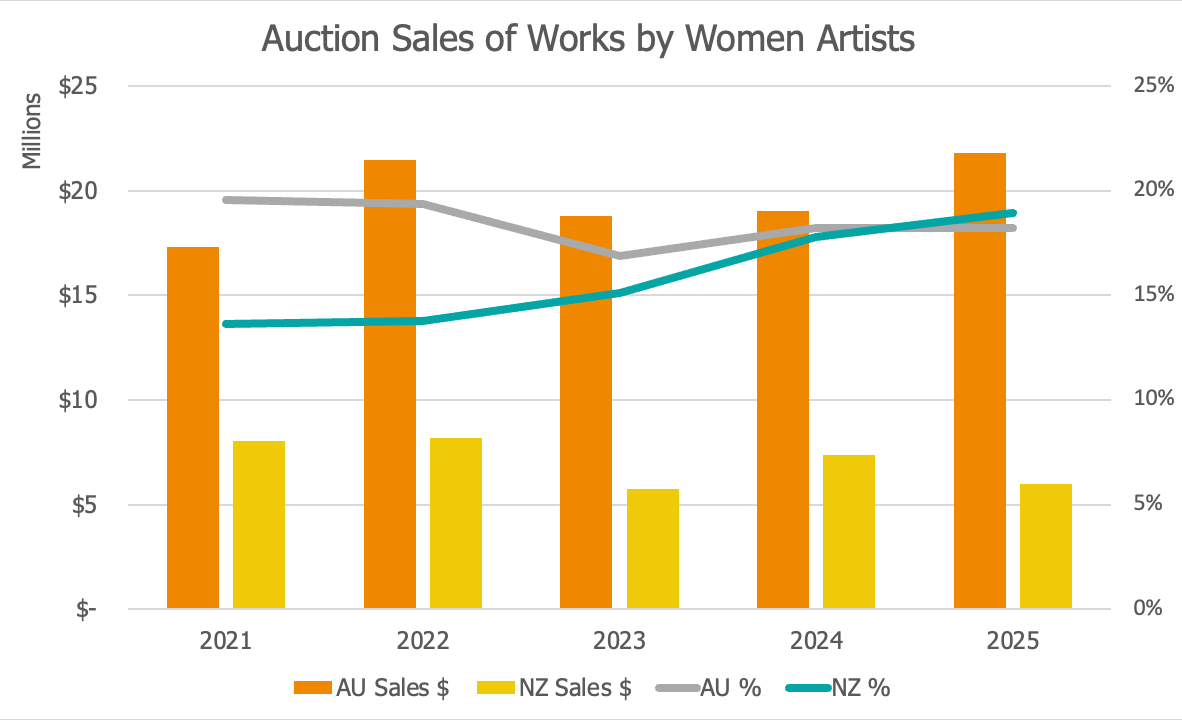 This analysis draws on my 2025 reports on the fine art auction markets in Australia and New Zealand. Those reports provide a data-driven review of the year’s key results, trends, and pricing signals. What follows is a closer look at how women artists were represented in those markets in 2025, and where the strongest gains and the clearest gaps remain.